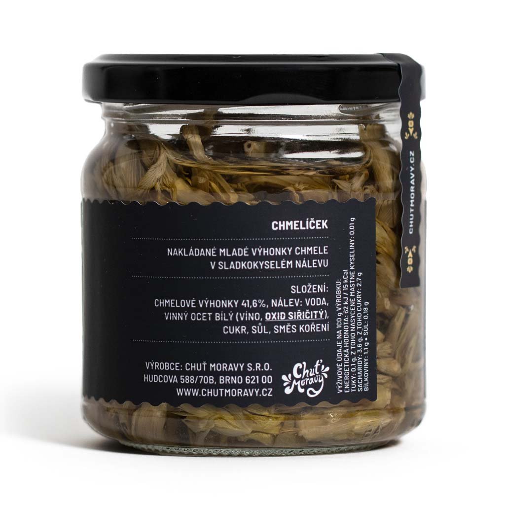 Chmelíček je ručně vyráběná delikatesa z mladých výhonků chmele. Ty trháme na jaře ihned, jak vyraší ze země, a nakládáme je do výborného sladkokyselého, jemně kořeněného nálevu. Tato stará, zapomenutá receptura byla oblíbená u našich předků již v 17. století. Chmelíček vás překvapí svou lahodnou chutí s jemným hořkým nádechem chmele. Vyzkoušejte, jaké to je „nachmelit se" bez následné kocoviny. :)