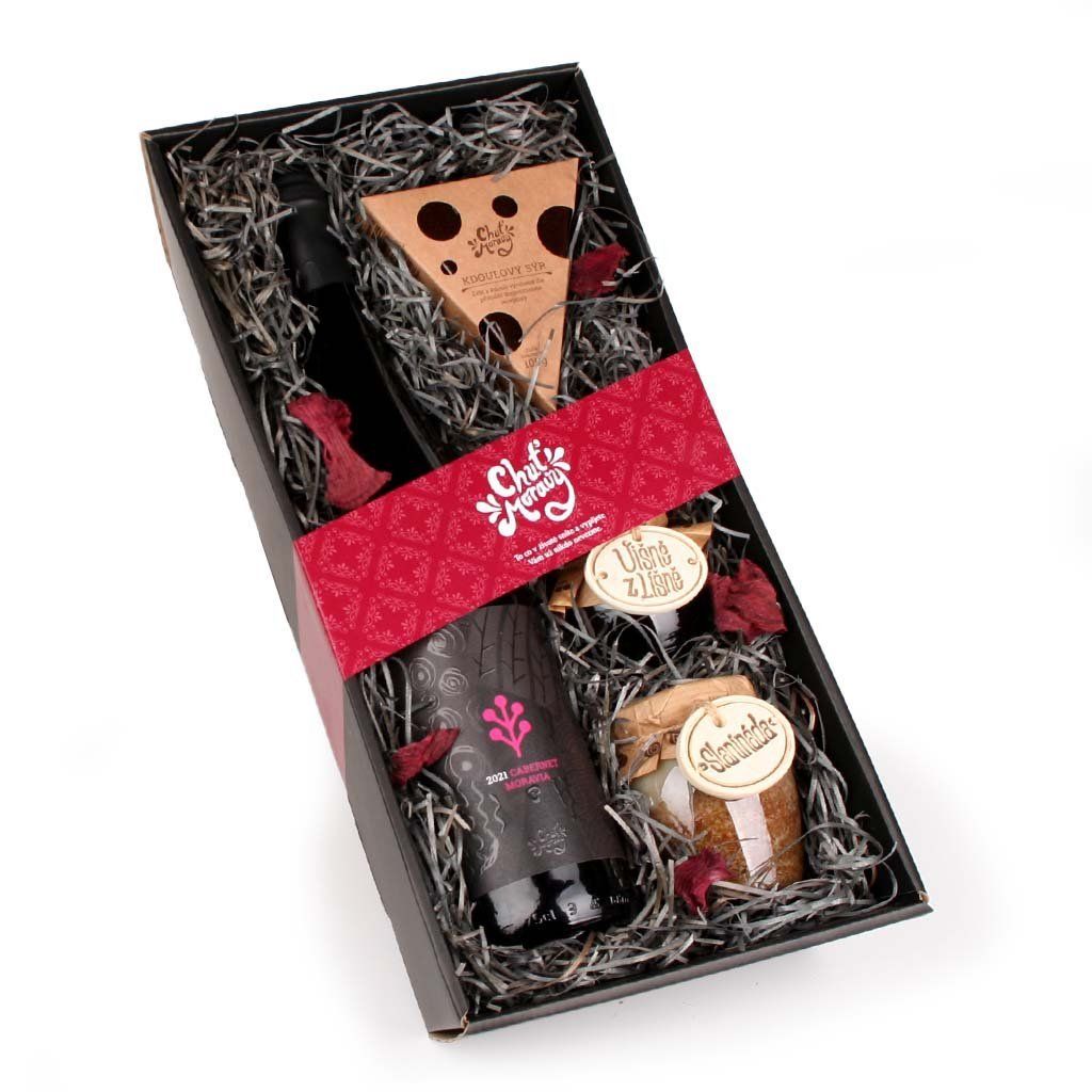 Červený balíček si žádá červené víno a to ne ledajaké. Dornfelder doplňuje Vinné želé, velká sklenice Slaninády a Kdoulový sýr.