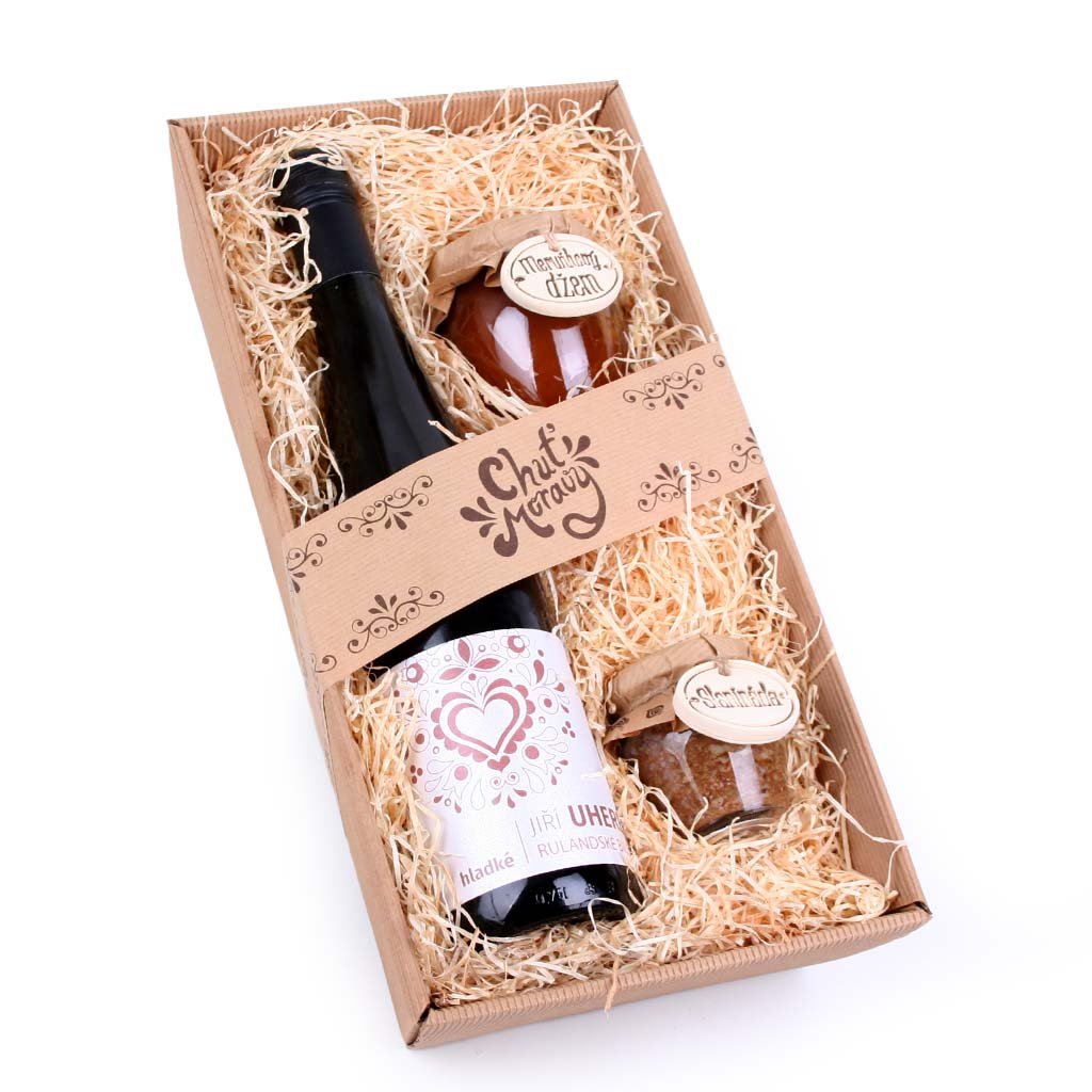 Daňáček - balíček plný moravských specialit jako je Rulandské bílé od vinaře Ing. Jiřího Uherka, slanináda a moravským sluncem provoněný meruňkový džem. Díky své ceně do 500 Kč bez DPH je odečitatelnou položkou z daňového základu.