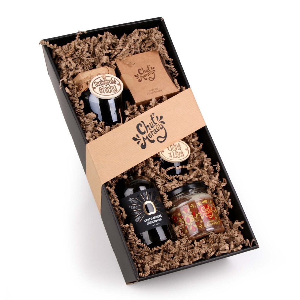 Darujte k slavnostní příležitosti tento balíček plný jedinečných delikates. Svatojánské ořechy naložené ve vánočním koření skvěle doplní sýry nebo paštiku, slanináda může posloužit jako překrm na opečeném toustu nebo bagetě, višně z Líšně pak doplní pečené maso. Jako digestiv poslouží sklenička lahodné Svatojánské ořechovky a na závěr škvarkoláda v kombinaci se sušenými švestkami.