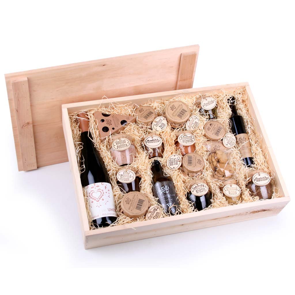 Velká Morava jak už název napovídá, je ta největší bedna z naší nabídky a je doslova našlapaná našimi delikatesami. Najdete v ní i několik sezonních specialit, které už samostatně nenabízíme. A jako bonus vše zabalené v exklusivní bedně z olšového dřeva ze Znojemska, speciálně vyrobené pro Chuť Moravy.