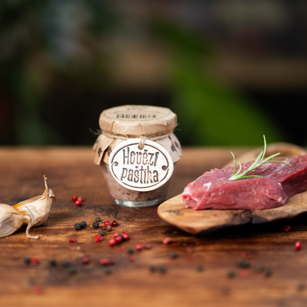 Tato hovězí paštika je pečena z vyzrálého hovězího masa. Společně s játry, vepřovým bůčkem, trochou červeného vína a kořením se nám podařilo vyladit paštiku na kterou jen tak nezapomenete. A protože veškeré použité maso je v bio kvalitě a i následný proces výroby probíhá bez přidání jakýchkoliv chemických konzervantů vyjma soli, můžeme hrdě prohlásit tuto paštiku za vyloženě zdravou. :)