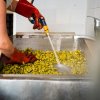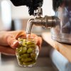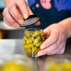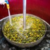 Po přivezení zelených mandlí v bedýnkách do naší výrobny začíná mravenčí práce. Nejprve musíme každou mandličku několikrát propíchnout (4) kovovou jehlou, abychom ji mohli v horké koupeli zbavit chlupaté slupky (5). Tím se mandle stávají hladké a příjemné na chuť. Oloupané mandle pak navážíme na přesnou váhu do sklenic, zalejeme je nálevem (6) a zavaříme do jemného sladko-kyselého nálevu (7), který uchovává specifickou ovocnou chuť mandlí, jež vzdáleně připomíná chuť bílých broskví.