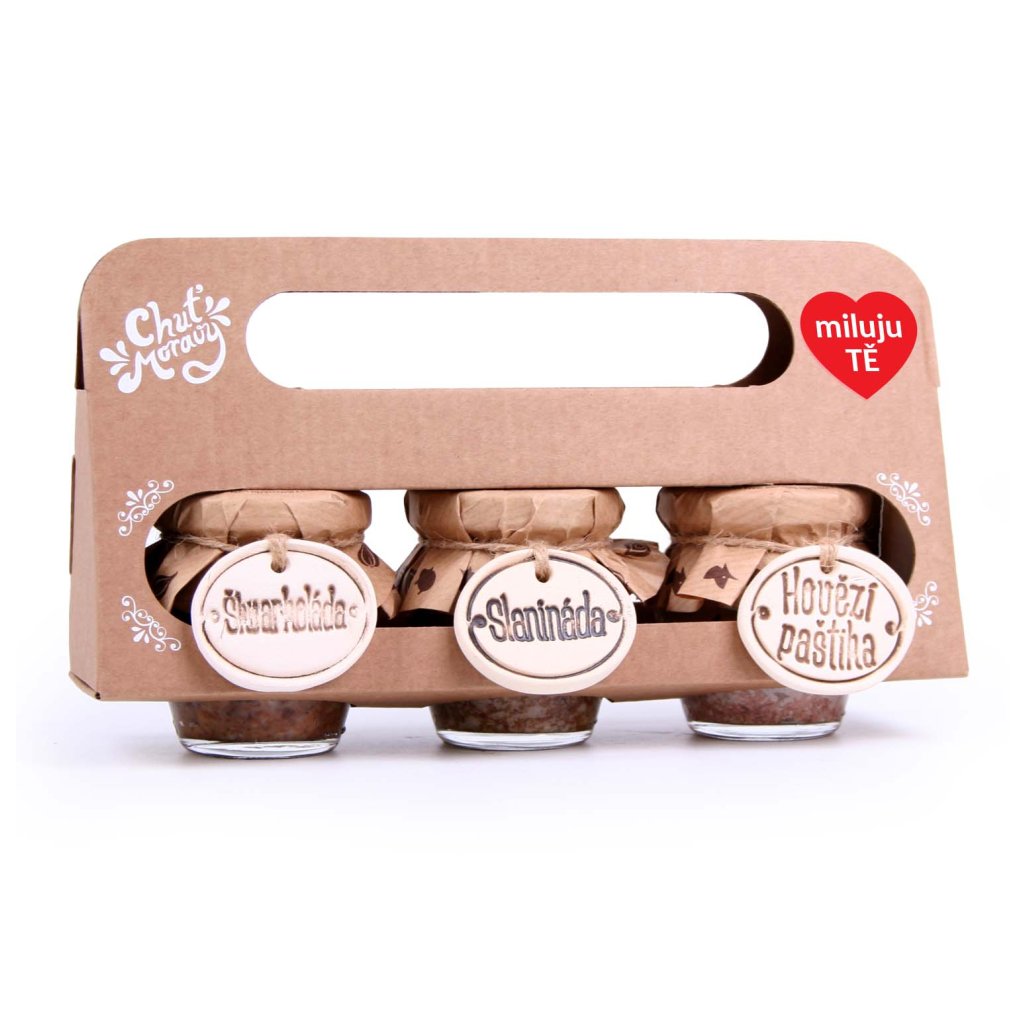 Najdete v ní tři naše nejoblíbenější masové delikatesy: Slaninádu, pečenou hovězí paštiku a novinku Škvarkoládu – pěkně pohromadě v praktické kartonové odnosce.