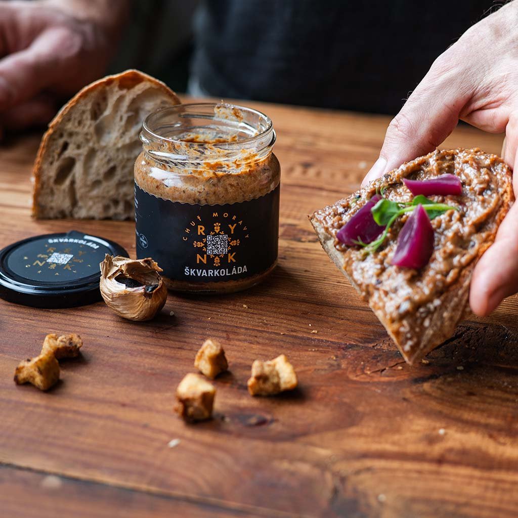 Škvarkoláda je jemná pomazánka s kousky škvarků a nakládaných švestek ve víně. Je tak akorát slaná, s lehkou sladkostí jablek a švestek, doplněná o umami chuť černého česneku a lahůdkového droždí s lehkým kouřovým aroma po uzených škvarcích.