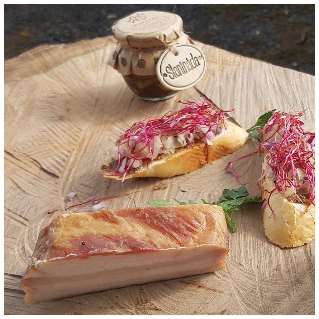 Jak nejlépe charakterizovat Slaninádu? Jednoduše řečeno, jde o slaninový džem. Základem této pochoutky je kvalitní moravská slanina, kterou nám udí pan řezník Josef Jůza z Březiny u Tišnova (1). Připravuje ji pro nás tradiční metodou – naloženou pouze v kuchyňské soli, (2) bez dalších přísad.