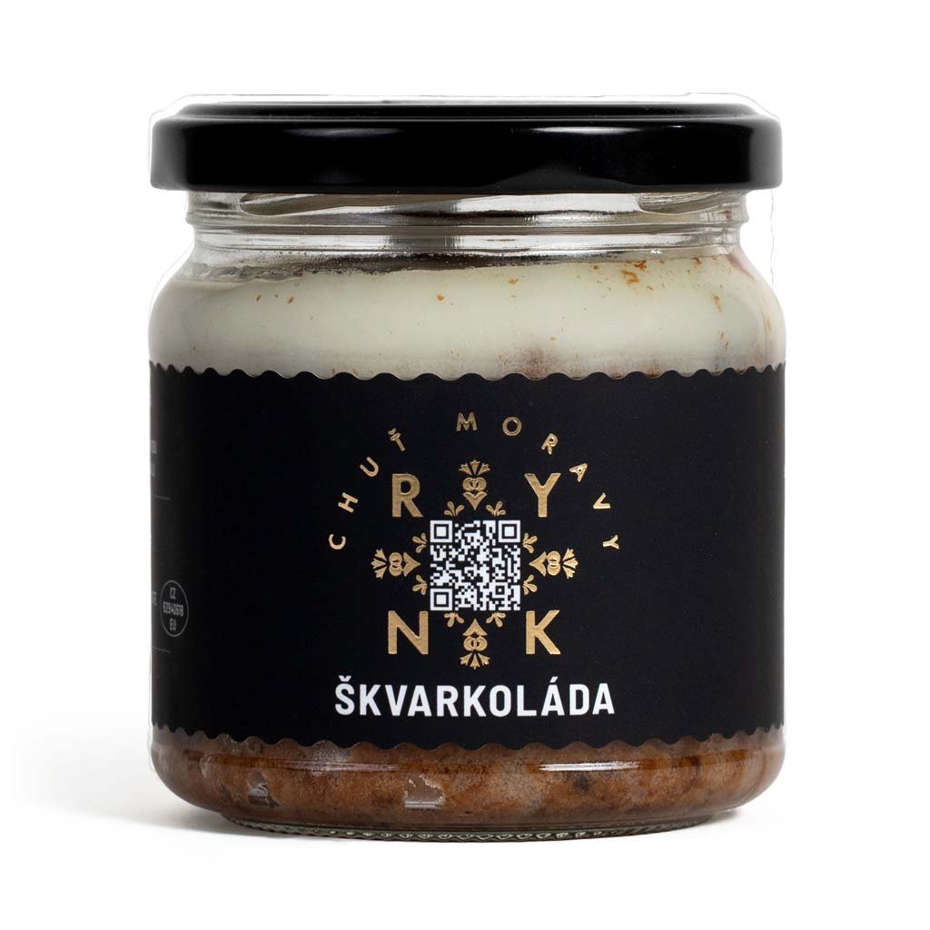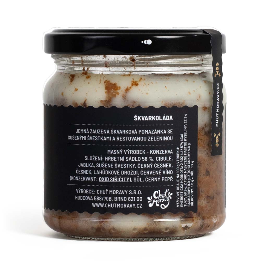 Škvarkoláda je jemná pomazánka s kousky škvarků a nakládaných švestek ve víně. Je tak akorát slaná, s lehkou sladkostí jablek a švestek, doplněná o umami chuť černého česneku a lahůdkového droždí s lehkým kouřovým aroma po uzených škvarcích.