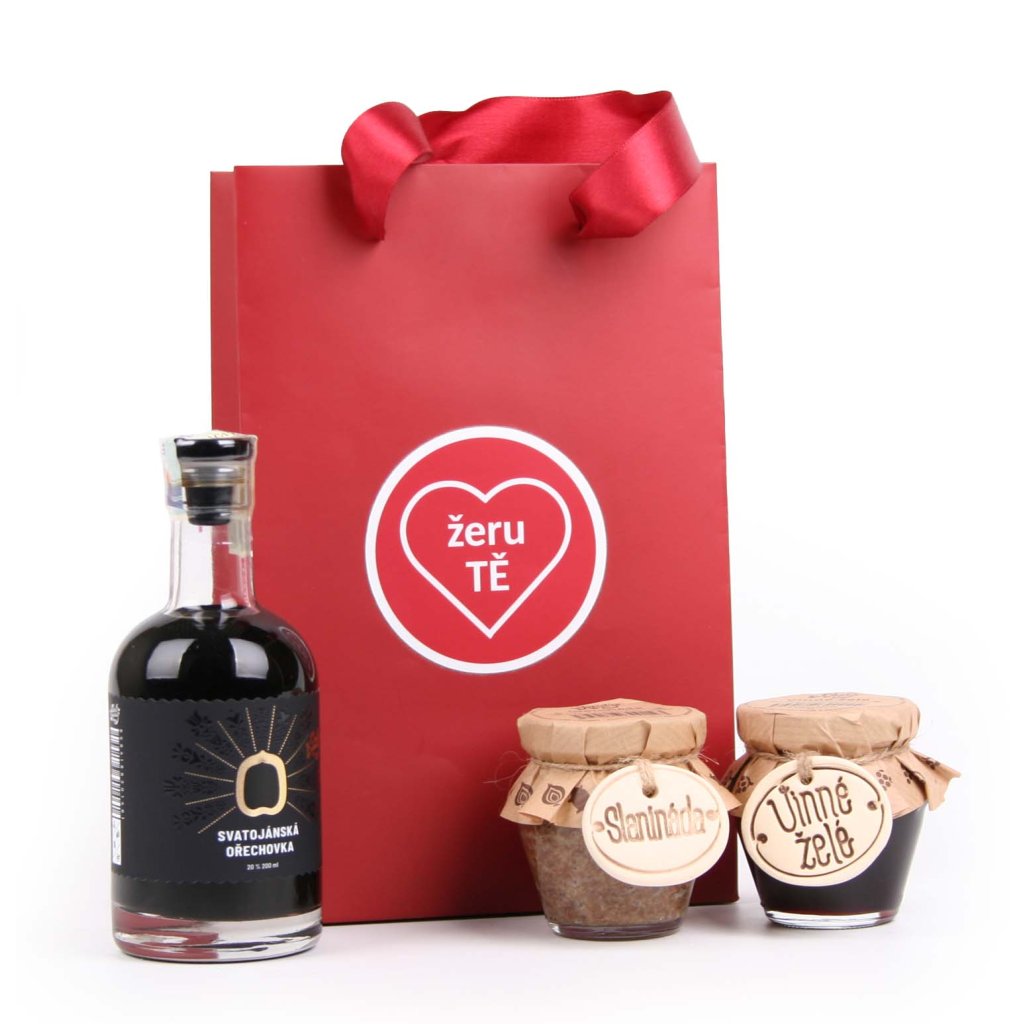 Udělejte radost na Valentýna svému milému dárkovou taškou se třemi vybranými delikatesami, které ho zaručeně potěší. Pochutná si na slaninádě, vinném želé a Svatojánské ořechovce.